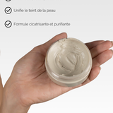 Sanft, die weisse Tonerde einigt die Haut und macht sie geschmeidig. Dank ihrer heilenden und beruhigenden Eigenschaften hilft sie, Akne-Spuren zu mindern.