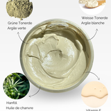 Komposition : Aqua, Kaolin, Montmorillonite, Cannabis Sativa Seed Oil, Cetearylalkohol, polysorbate 60, Tocopherol, Cosgard, Helianthus Annuus Seed Oil, Parfum, alpha-isomethyl ionone, benzyl salicylate.